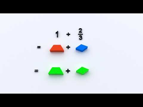 À l'aide du modèle de surface, illustrons un (1) par un trapèze rouge qui est l'unité de référence. Ce tout peut être subdivisé en 3 parties égales en d'autres termes par 3 triangles verts. Chaque triangle représente 1/3 par rapport à l'unité de référence. Le losange bleu représente 2 triangles verts, donc 2 triangles verts parmi les 3 qui structurent le tout de référence. En utilisant le sens de l'addition la composition de deux états en un troisième état, on pourra réunir les 3 triangles qui représentent l'entier de référence et les 2 triangles qui représentent 2/3. Nous avons 5 triangles dont chacun représente 1/3.