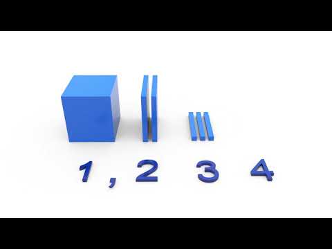 Une unité représentée par un gros cube, deux plaquettes représentant deux dixièmes, trois bâtonnets représentant trois centièmes et finalement quatre petits cubes représentant quatre millièmes.